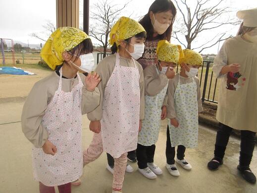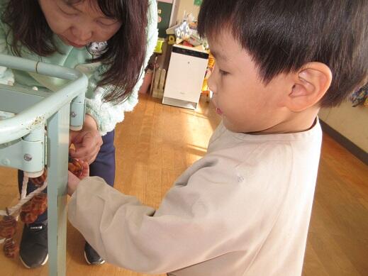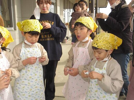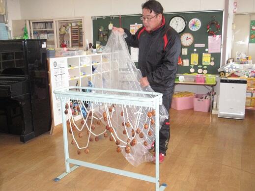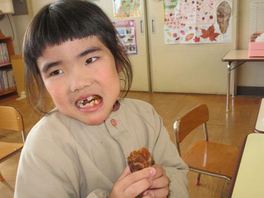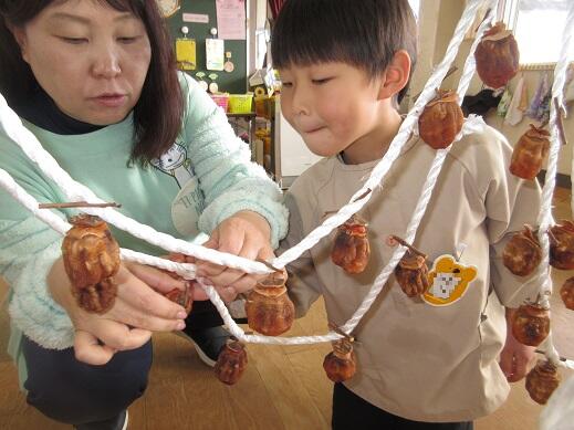 2024年12月9日 14時31分12月9日(月)11月の初旬に渋柿の皮をむいて、幼稚園のテラスに干していました。ちょうど一か月が経って、干し柿が食べられるようになりました。今日は、できた干し柿の試食です。まだ食べたことのない子が3人いて、恐る恐るはじめての干し柿を食べる経験をしました。