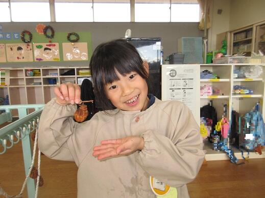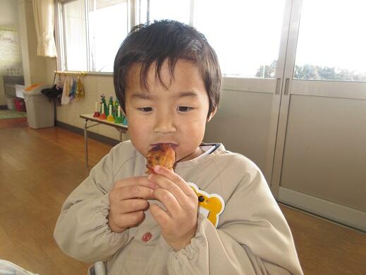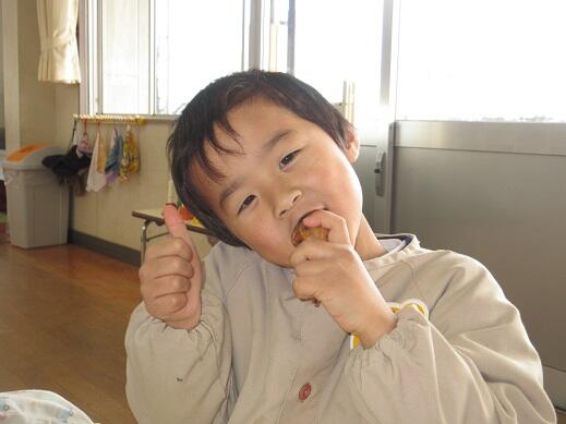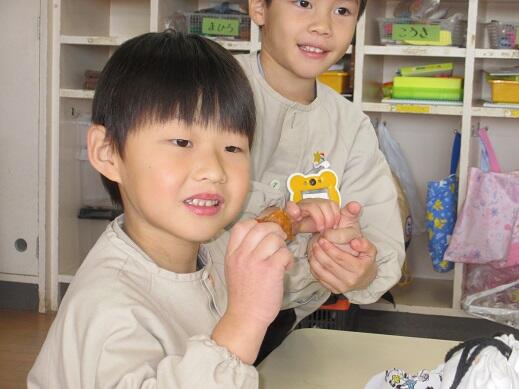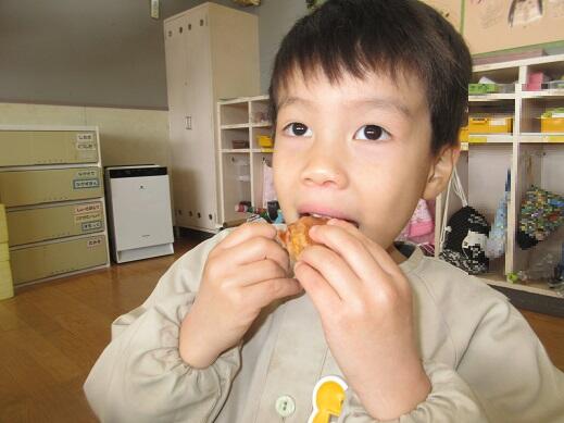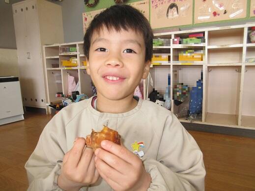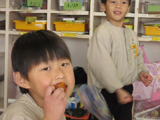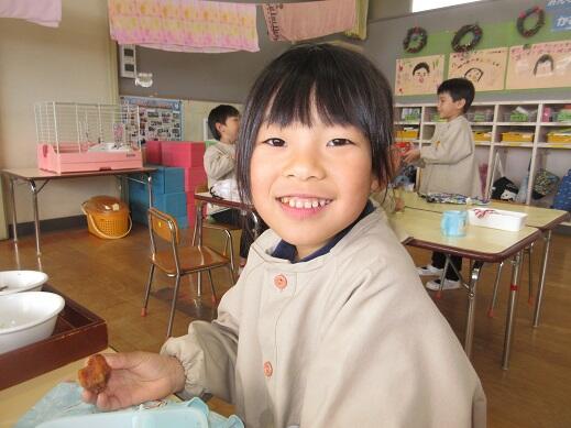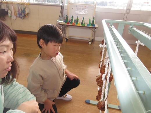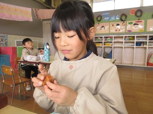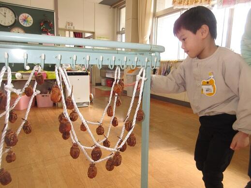 12月9日(月)11月の初旬に渋柿の皮をむいて、幼稚園のテラスに干していました。ちょうど一か月が経って、干し柿が食べられるようになりました。今日は、できた干し柿の試食です。まだ食べたことのない子が3人いて、恐る恐るはじめての干し柿を食べる経験をしました。