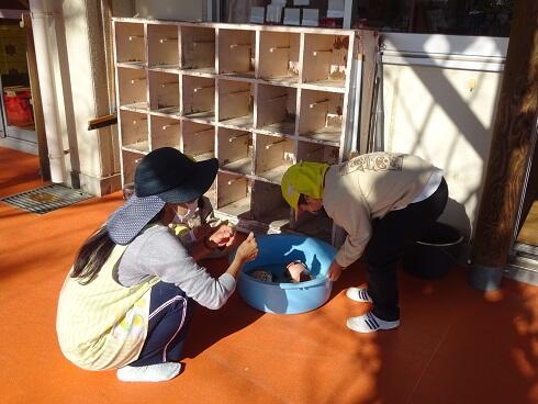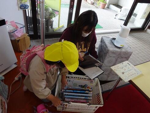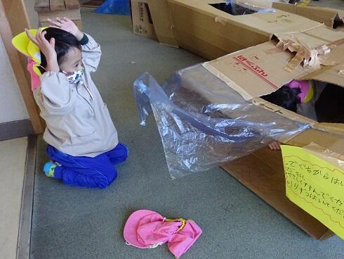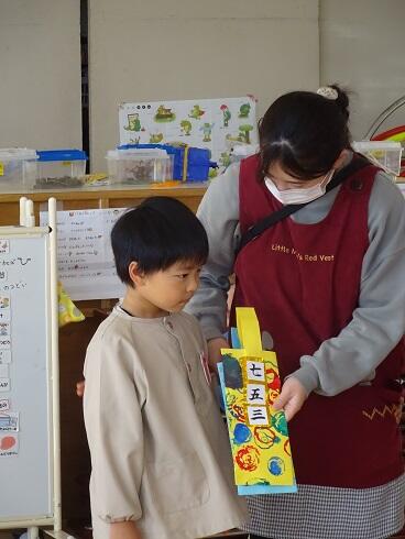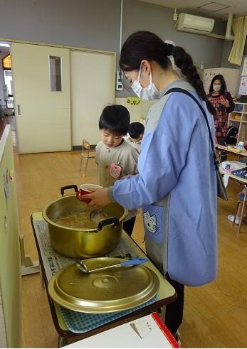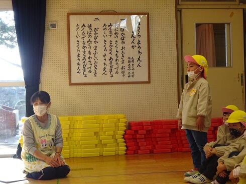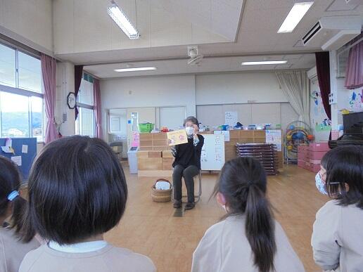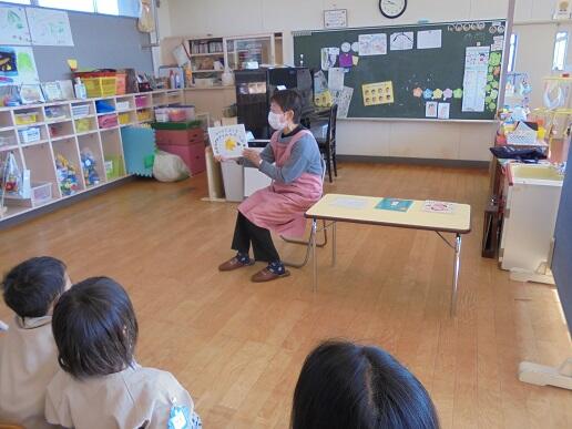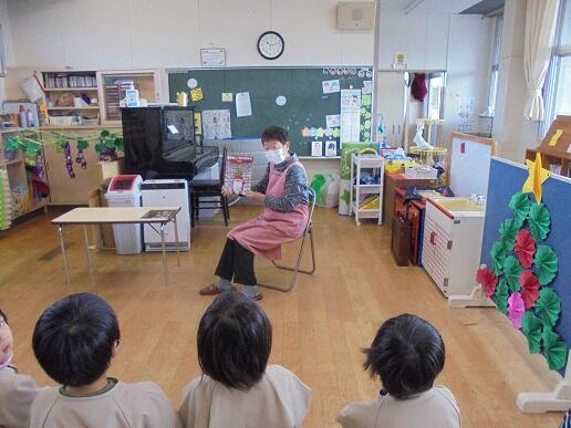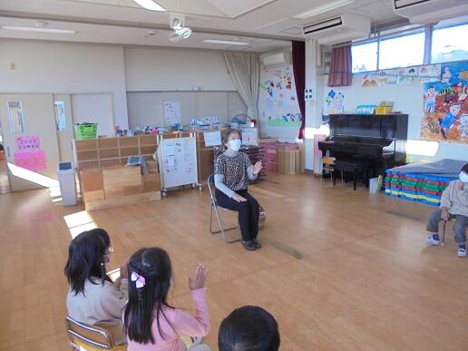 2021年12月1日 10時24分12月1日(水) あづま子どもの本の会より篠原和子さんと松本貞子さんに来ていただき、「12月の読み聞かせ」を行いました。年少組では篠原さんに、絵本「100にんのサンタクロース」「メリークリスマスオオカミさん」「みんな」「たいこ どん」、紙芝居「ばけこちゃんのおおそうじ」を読んでいただきました。紙芝居はシリーズもので子供たちも、前の紙芝居を思い出し、お話を聞いていました。年長組では松本さんに、絵本「だるまちゃんとてんぐちゃん」と「パトカーのピーすけ」、手袋人形で「かんがえごと」、お手玉遊び「あんたがたどこさ」を読んだり、遊んだりしていただきました。体を動かす遊びも多く、男の子たちが盛り上がって参加しました。