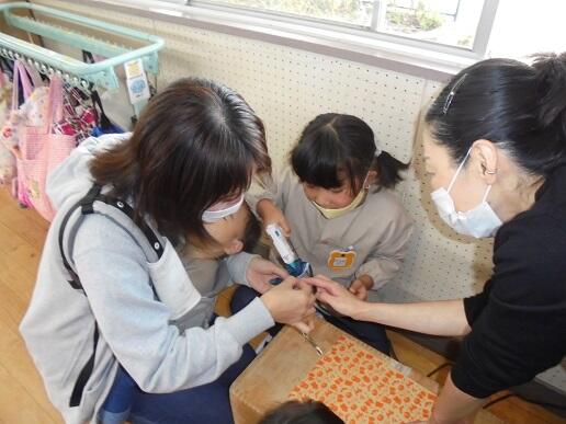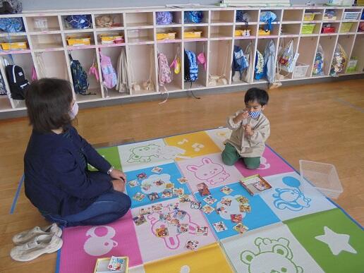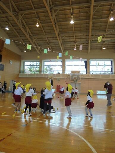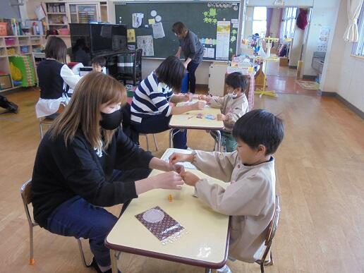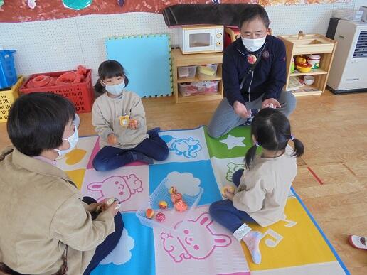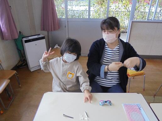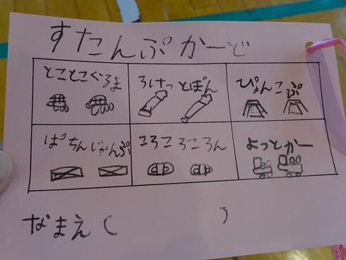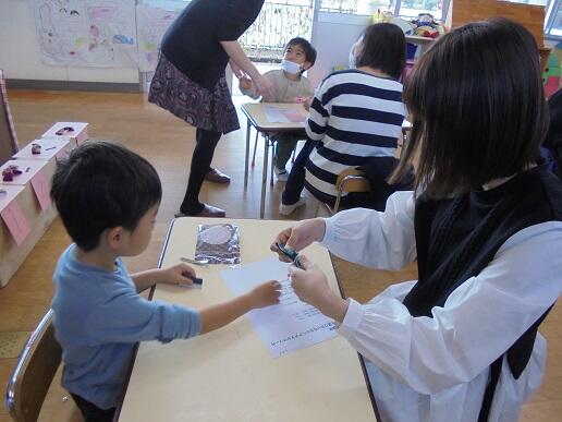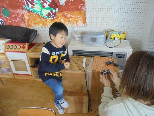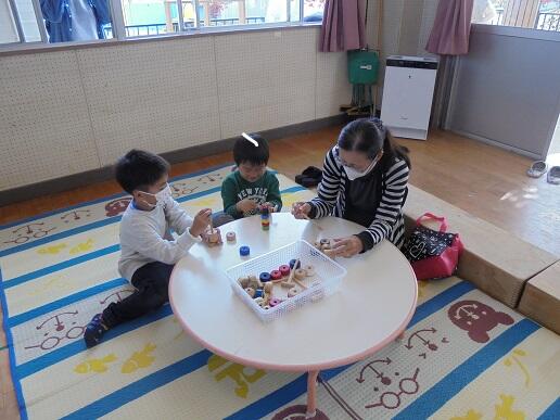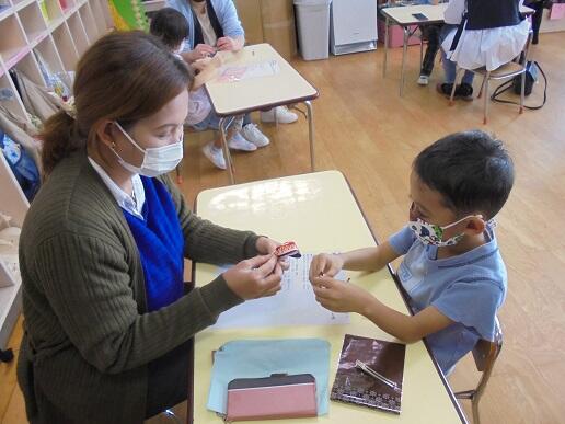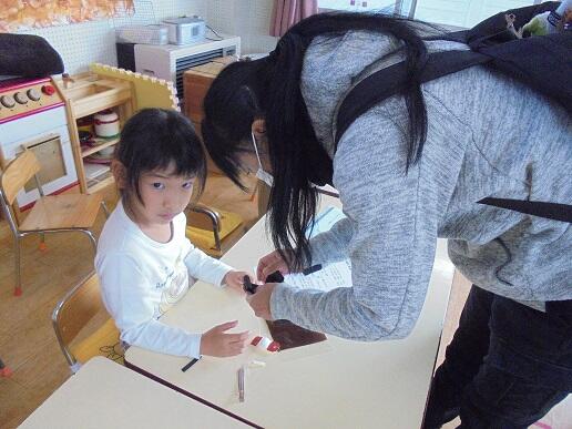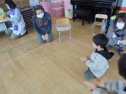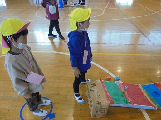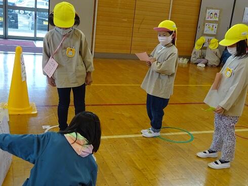 11月10日(水)庭塚小学校の2年生のみなさんから、おもちゃ祭りへ参加しませんかとお誘いがありました。年長組が小学1年生と一緒におもちゃ祭りに参加しました。風やゴムで動くおもちゃ、ロケットのように飛び出すおもちゃ等、楽しいおもちゃがたくさんありました。子どもたちは、時間を忘れて一つ一つ楽しみながら、それぞれのグループをまわり遊んでいました。2年生のお店をまわって遊ぶことでたくさんの経験をしたようです。これからも小学校と楽しく勉強になる交流ができそうです。