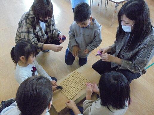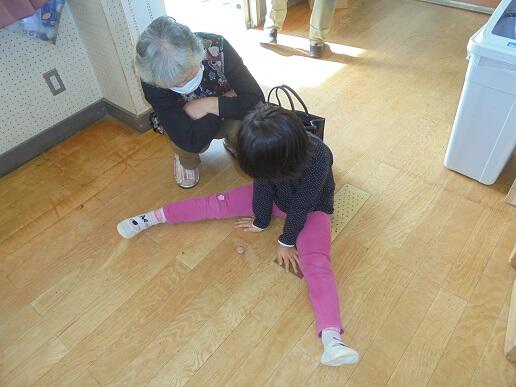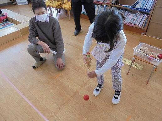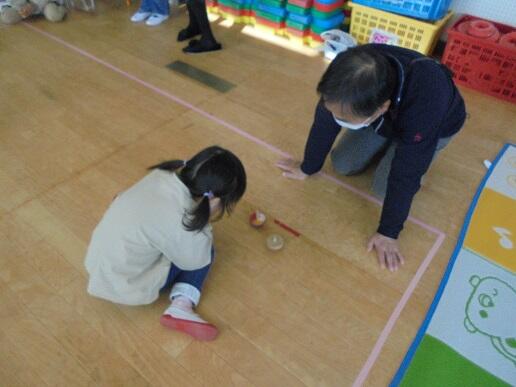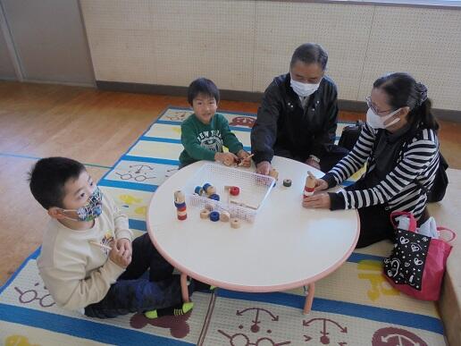 11月1日(月)祖父母参観に、たくさんのおじいちゃんやおばあちゃんが来てくれました。昔遊びのお手玉やカルタ、だるま落とし、けん玉、コマで子どもたちと触れ合っていただきました。そのあと、ダンスを発表し、子どもたちからお礼のお菓子を渡しました。あたたかい日差しの中、おじいちゃんやおばあちゃんと思う存分遊ぶことができた日となりました。