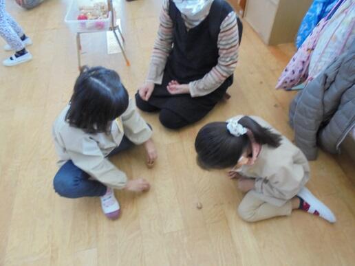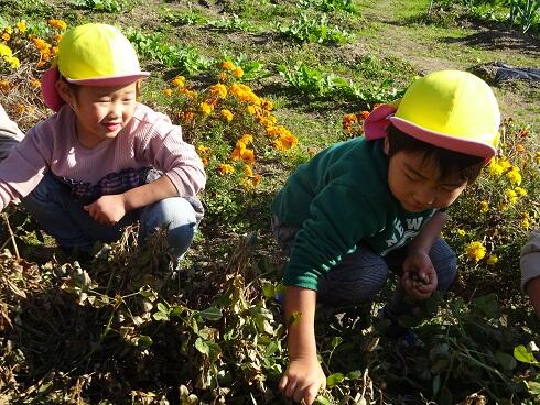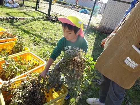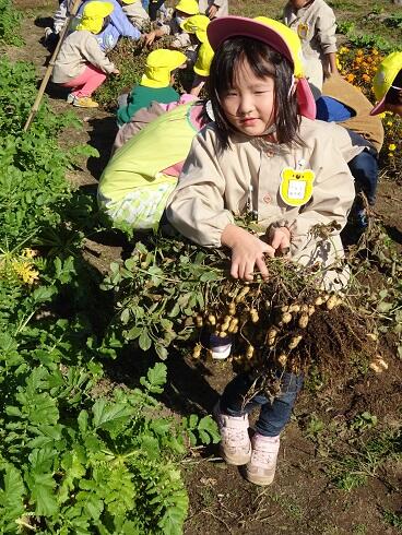 11月5日(金)春から育てていた落花生がいよいよ収穫時期になりました。子どもたちは、どこに落花生が実っているか知りません。全員に落花生のある場所と収穫の仕方を教えて、いよいよ収穫です。初めて育てた落花生の実を大切に収穫していました。すべて収穫が終わるまで、集中して活動をしていました。とても楽しかったようです。