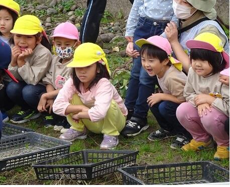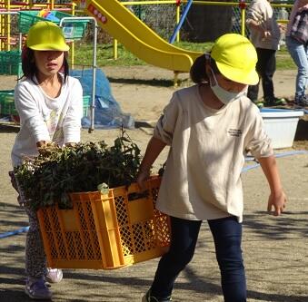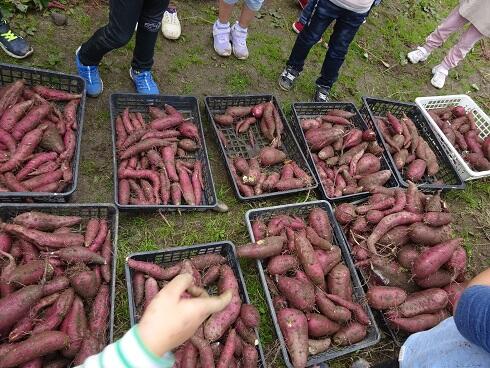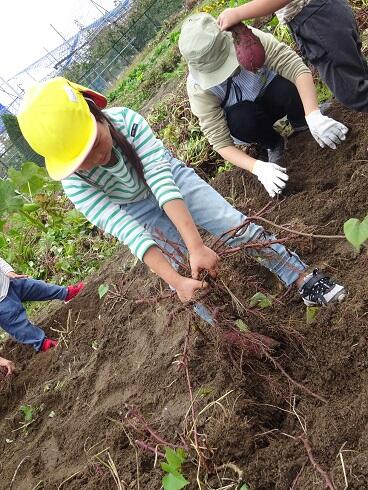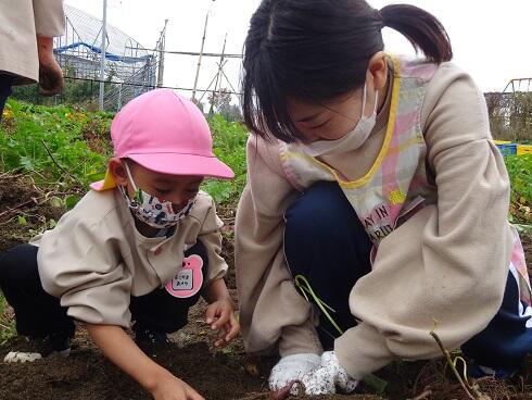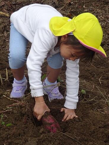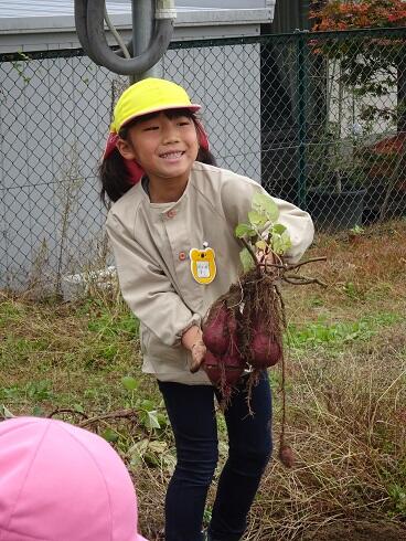 11月2日(火)今日は、みんなでサツマイモ(紅はるか・紅あずま)を収穫しました。土の中から大きく育ったサツマイモがでてきました。「大きなサツマイモがとれました。」の声があちらこちらで、聞こえました。グループで力を合わせ、引っ張る姿も見られました。甘みのあるサツマイモをどのようにして食べるか、相談したいと思います。