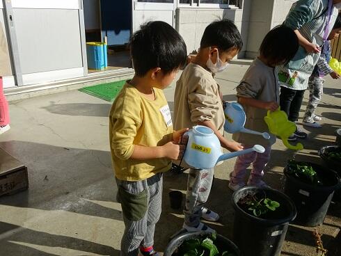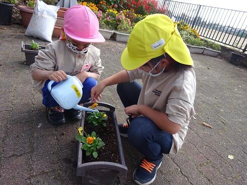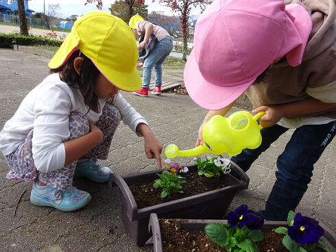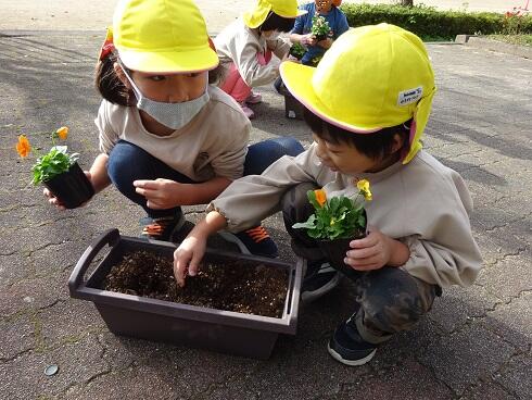11月5日(金)玄関のプランターにパンジーを植えました。仲良しグループごとに一人一つのパンジーを植えました。年長さんは、小さい子たちが上手に植えられるようお世話をしていました。きれいな花たちが玄関を華やかにしました。