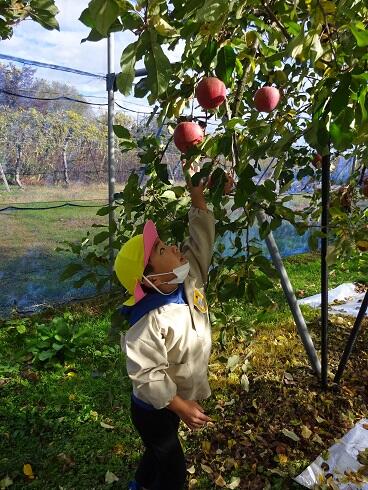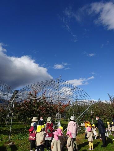 11月10日(水) 近くの紺野果樹園さんにリンゴ狩りに行ってきました。果樹園には「サンフジ」がおいしく実っていました。紺野さんから「リンゴの取り方」や「リンゴの種類」のお話を聞いて、リンゴ狩りをしました。今回は、糖度計で、もぎったリンゴの糖度を測ってもらいました。測定すると糖度が20度近くありました。味見をさせてもらったら、すごく甘いリンゴで、子どもたちも満面の笑みでした。天候にも恵まれ、最高のリンゴ狩りとなりました。