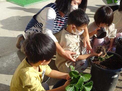 2021年11月12日 15時47分 11月12日(金) 年少組では、来年の春に実がなるイチゴの苗を大きな鉢に植えました。イチゴの苗は、昨年年長組が育てていたイチゴからでてきたものです。大きく育った苗を優しくポットから出して、鉢に植えました。これから春まで大切に育ててもらいたいと思います。赤いイチゴがたくさんなるといいですね。