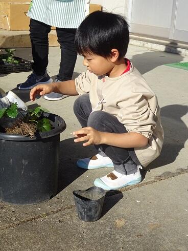 11月12日(金) 年少組では、来年の春に実がなるイチゴの苗を大きな鉢に植えました。イチゴの苗は、昨年年長組が育てていたイチゴからでてきたものです。大きく育った苗を優しくポットから出して、鉢に植えました。これから春まで大切に育ててもらいたいと思います。赤いイチゴがたくさんなるといいですね。