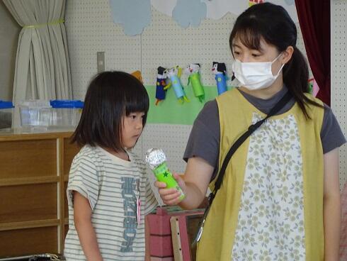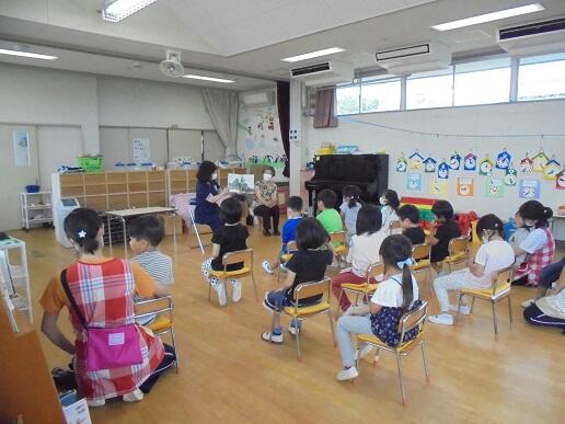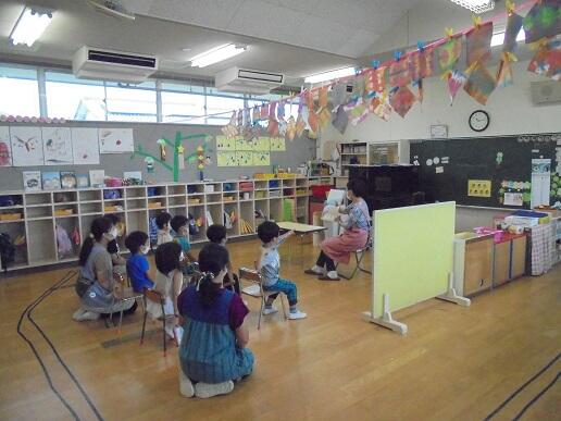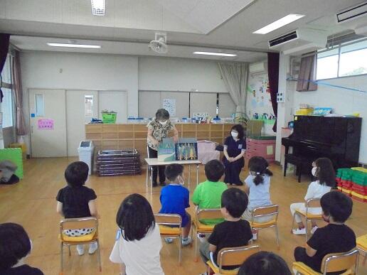 7月7日(水)7月のお話し会を行いました。あづま子どもの本の会から年少組に篠原さん、年長組に、松本さん、吉野さんに来ていただきました。年少組は、絵本「ぼくそらをさわってみたいんだ」「ゆっくりのんのちゃん」「でんしゃくるかな」、紙芝居「とりのすみーつけた」大型絵本「でんしゃにのって」を読んでいただきました。子どもたちは乗り物が好きなので、電車の話を夢中できいていました。年長組は、絵本「たのばたにょうぼう」「たなばたのねがいごと」、かわり絵本「おばけの森」を読んでいただきました。おばけの話が大好きで大きな声でおばけのいない道を答えていました。
