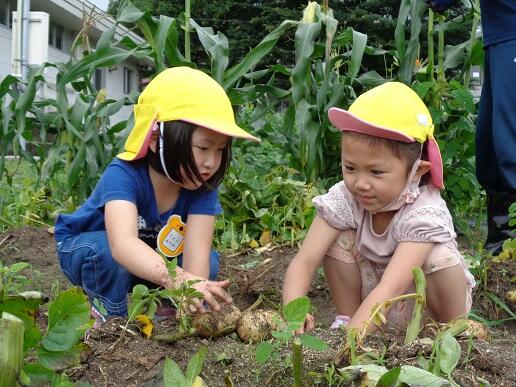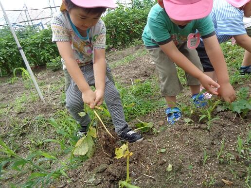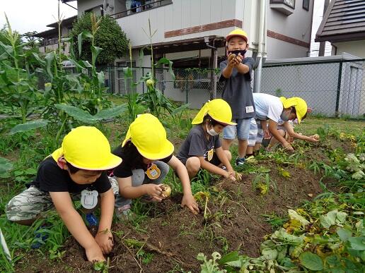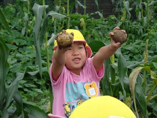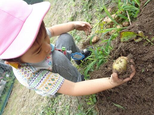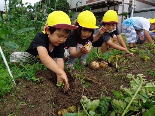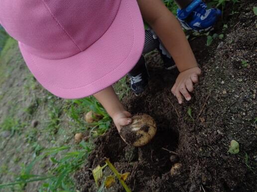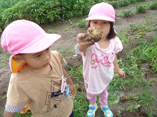 7月8日(木)ジャガイモをみんで掘り起こしました。4月に植えたジャガイモは、大きくなり、顔の大きさにちかいジャンボジャガイモもありました。全員で汗をかきながら、大きなジャガイモを掘り起こしました。あちらこちらで、大きいジャガイモが出てくるたびに、大きな歓声が上がりました。総重量が100kgを超えて大豊作でした。子どもたちは、何に料理して食べようかと、みんなで考えていました。