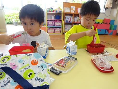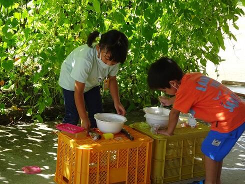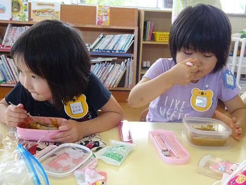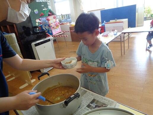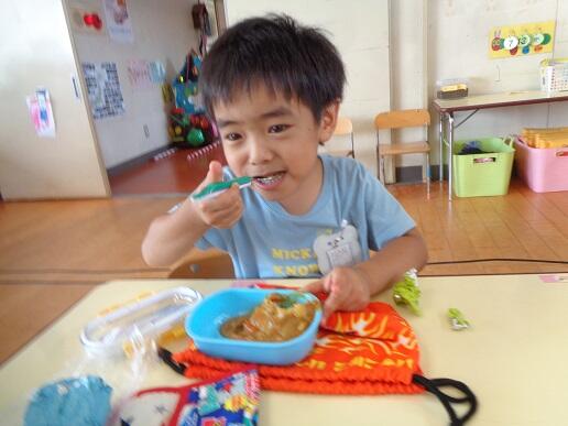 7月13日(火)畑でとれたジャガイモと玉ねぎを入れてカレーライスを作りました。ジャガイモは自分たちで育てたものなので、おかわりをする子がたくさんいました。とれたて野菜はとてもおいしいですね。