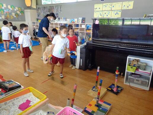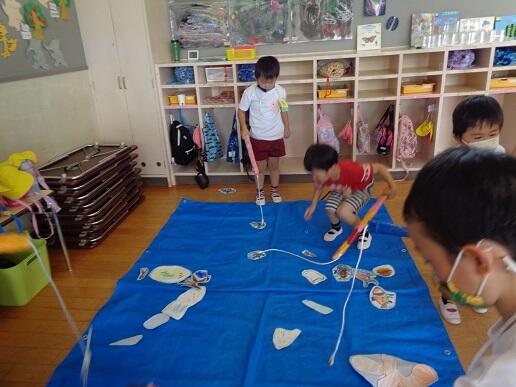 7月15日(木)佐倉幼稚園のみんなが庭塚幼稚園に来て交流しました。庭塚幼稚園のみんなは、「魚釣り」「ボーリング」「輪投げ」のお店を開き、楽しく遊べるようにしました。自由遊びの時間、登り綱のコーナーでは、佐倉幼稚園の初めて挑戦した子も、一番上まで登ることができ、みんなから拍手をもらっていました。