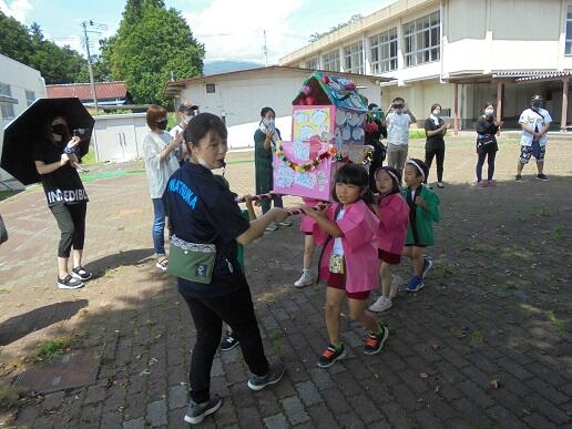 後半は、今までみんなで作ったおみこしを担ぎ、小学校の中庭で小学生に見てもらいました。威勢よく「ワッショイ、ワッショイ」と言いながら、二つのおみこしが中庭を練り歩く姿は、いかにも楽しい夏祭りでした。おみこしには、子どもたちが大好きな友達の顔やポケモン、そして、今まで畑でつくった野菜たちが描かれています。保護者の皆さんや応援してくれる小学生に囲まれて、とてもうれしい夏祭りとなりました。