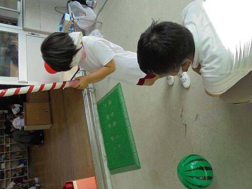 7月16日(金) 庭塚幼稚園の夏祭りの日です。今年は、前半が保護者のみなさんのお店が3つ、子どもたちのお店が3つで、計6つのお店を親子で楽しむ活動をしました。保護者のみなさんのお店は、「スイカわり」「くじびき」「水ヨーヨー釣り」でした。子どもたちのお店は、「ボーリング」「輪投げ」「魚釣り」の3つでした。どのお店も楽しくまわることができました。