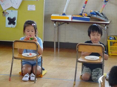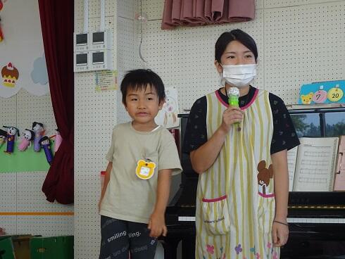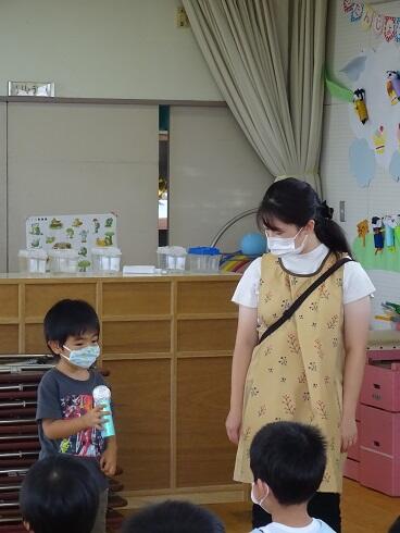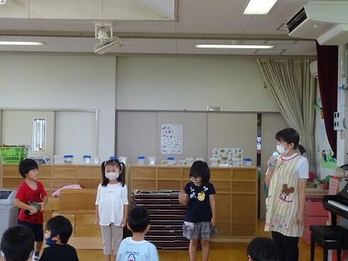 8月23日(月) 第2学期の始業式を行いました。年長さんの夏休みに「お掃除・皿洗い・カーテン閉め・お皿運びのお手伝い」を頑張ったことの発表がありました。みんな、お手伝いを頑張っていたことが分かりました。年少さんの夏休みの楽しかったことでは、「花火を見に行き、すごい音がドンドンとした」ことや「ブロックで遊んだ」ことが発表されました。園長先生からは、「コロナにかからないように注意すること」や「玄関に壁紙が張られてきれいになったこと」、「2学期は、自分で考えた実験をたくさんしよう」というお話がありました。