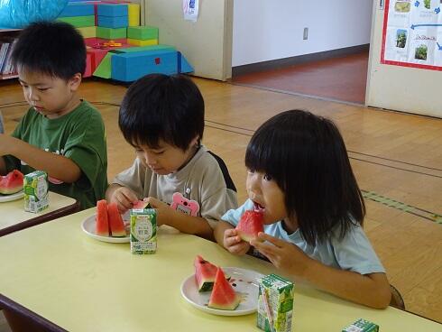 始業式の後、畑に野菜の収穫に行きました。食べごろのスイカをさがしたり、ナスやキュウリをたくさん収穫しました。畑のスイカを切ってもらい、みんなで楽しく食べました。みんなで食べるスイカは、とてもおいしかったようです。