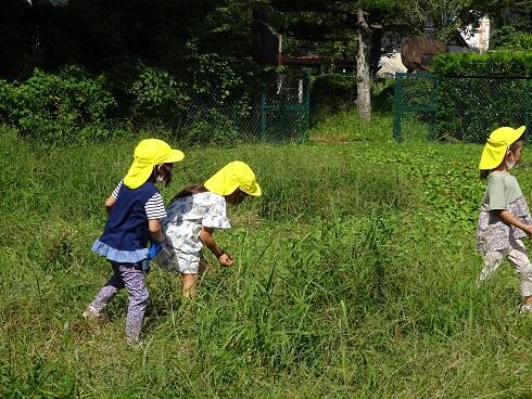 きょうは、虫捕り大会をしました。短い時間で、だれがたくさんの虫が捕れるか競争してみました。すると、トンボをとる子やバッタを素早くつかまえる子など、入園当初に比べればとても成長したなと実感した一日となりました。