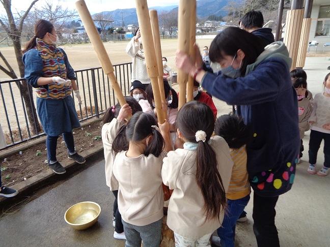 12月11日(金)保護者の皆さんの協力のもと、もちつき会が行われました。もち米をふかし臼と杵でおもちにしていきました。子供たちも、千本杵で餅をつく経験をしました。家庭での餅つきが少なくなる中で、幼稚園で行われることに、貴重な行事であることを実感しました。みんな、たくさんのおもちを食べて満足の一日となりました。