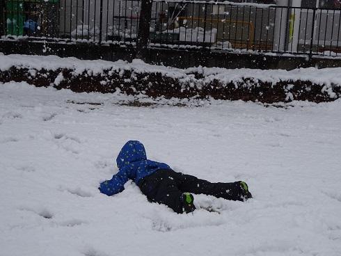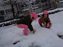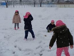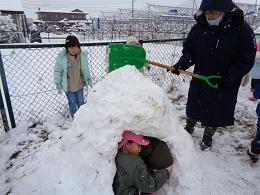 12月15日(火)今日は朝から雪が降り、子どもたちは雪遊びに夢中になりました。大きな雪だるまを作る子、雪の中にダイビングする子、雪合戦をする子など今年初めての雪に大はしゃぎでした。園長先生がかまくらを作ってくれました。作り方を手伝う子、かまくらの中に入る子等、雪の中で思う存分遊びました。