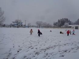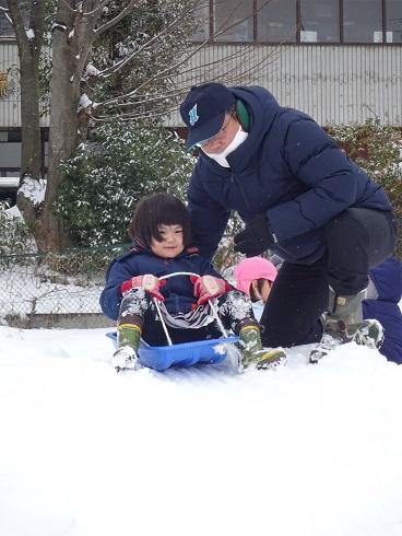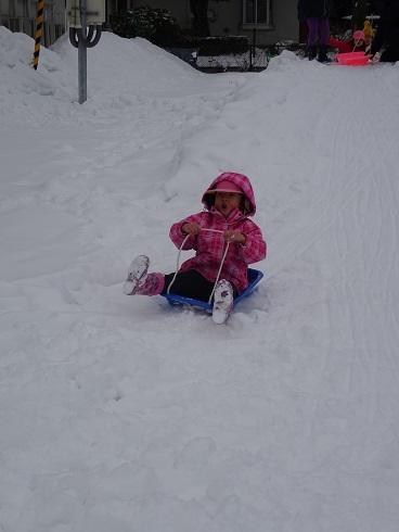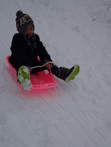 先生方が作ってくれた大きいそり滑りのコースを、子供たちは歓声を上げながらすべりました。初めてそり滑りをする子もいました。スピードも出てとても楽しかったようです。
