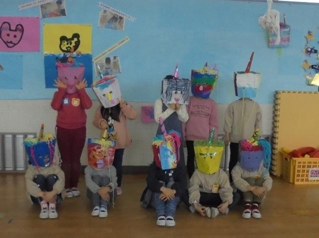 12月18日(金) お楽しみ会の年少組の出し物は、「森のお風呂」でした。いろいろな動物や怪獣になって、森のお風呂に入りにくるお話です。お風呂に入ると「背中洗ってちょうだい。」といいます。前の子が「いいよ」と言い背中を洗ってくれます。全員仲良くお風呂に入ることができました。年長組は、2つのグループに分かれて発表しました。中学生のまねをして絵本を作って読むグループは、しりとりの絵本などを作り発表しました。もう一つのグループは、「三匹のヤギのがらがらどん」(ひまわりバージョン)の絵本の劇を発表しました。ヤギたちは、橋を渡り草を食べに行きます。しかし、それをさせまいとするトロルと大きなヤギが対決するお話です。みんな準備も頑張り、上手に演技できました。