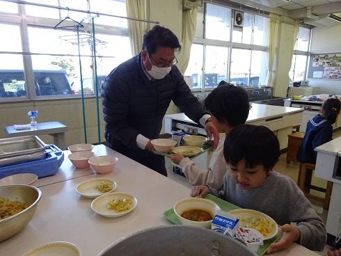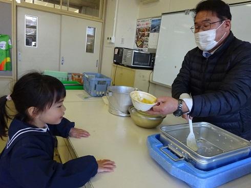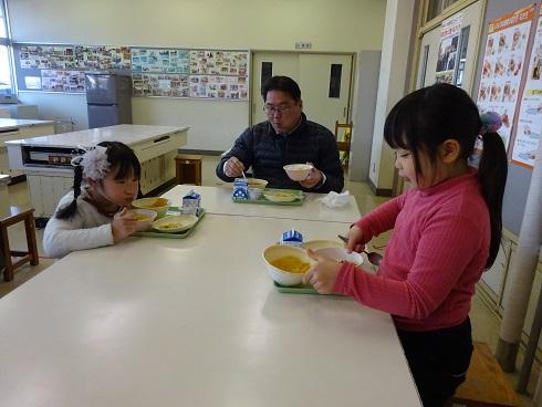 2月25日(木)給食試食会を実施しました。4月から小学校に入学する年長児は、庭塚小学校の家庭科室でカレーライスを試食しました。配膳の時、子供たちは自分のお盆を持ち、順番にカレーをわけてもらいました。こぼさないように、自分の机まで上手に運ぶことができました。「よい姿勢になってください。」「いただきます。」の合図で食べました。とてもおいしかったらしく、おかわりをする子がたくさんいて、ご飯を食べきることができました。4月から上手に給食が食べられるとよいですね。