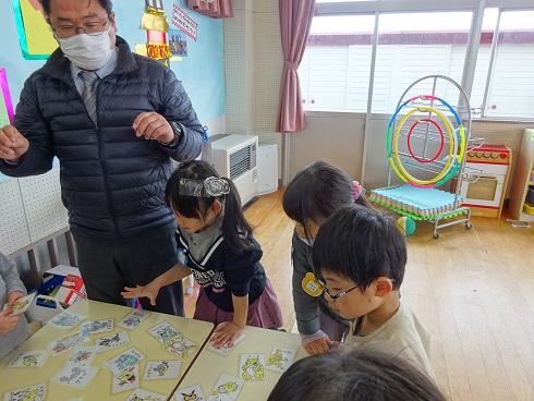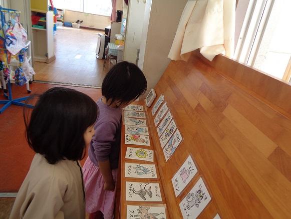 2月下旬、手作りカルタをつくり、みんなでカルタ遊びをしています。年長は、カタカナのカルタ、年少はひらがなのカルタをしています。絵を見て何が書いてあるか予想して、遊んでいます。みんなどんどん素早くなっています。