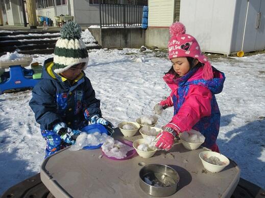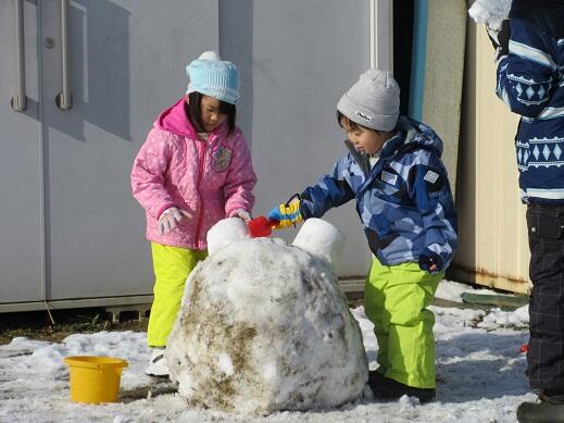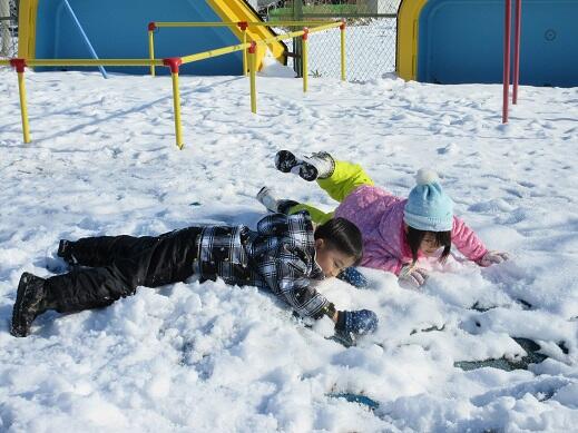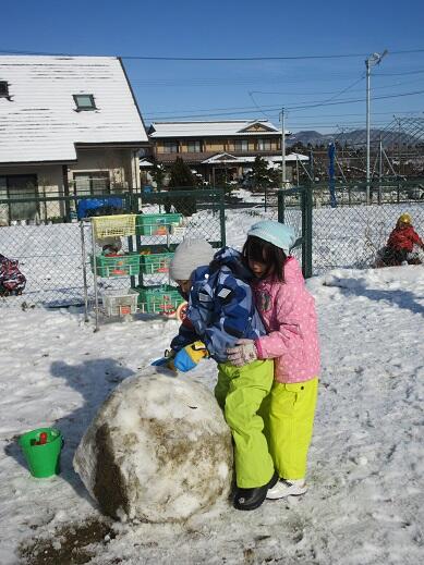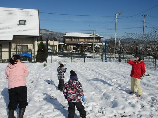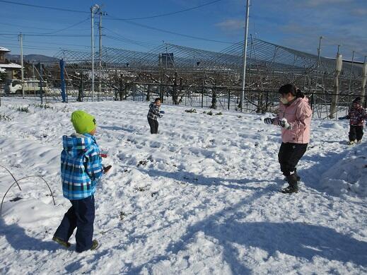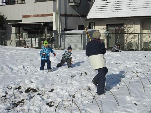 12月21日(水)雪が降り、園庭も畑も雪で覆われました。午前中天気が良く、みんなで外に出て、雪遊びをしました。畑では、数名で雪合戦をしました。園庭では大きな雪だるまをつくっていました。各々自分の好きな雪遊びをして、雪の感触を楽しみました。
