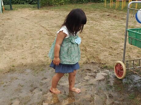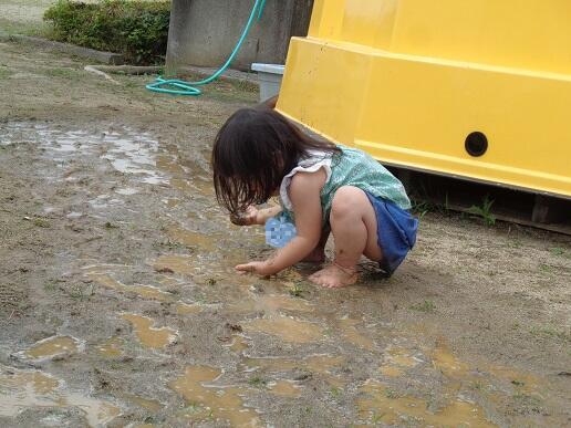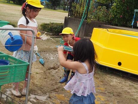 8月29日(木) 2・3歳児交流保育を行いました。園児の姉妹が来園し、砂場遊びとプール遊びをしました。砂場での泥遊びが楽しかったらしく、水を使って泥だらけで遊んでいました。その後、プールにみんなで入り、楽しく水遊びをしました。
