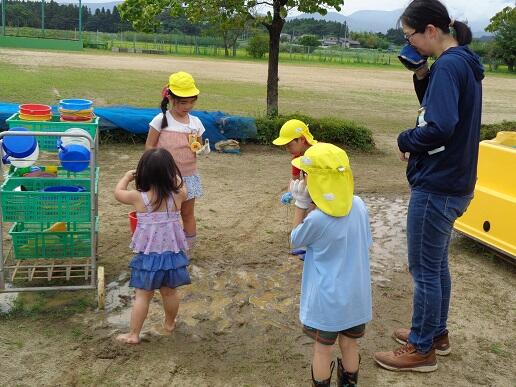 2024年8月29日 12時34分8月29日(木) 2・3歳児交流保育を行いました。園児の姉妹が来園し、砂場遊びとプール遊びをしました。砂場での泥遊びが楽しかったらしく、水を使って泥だらけで遊んでいました。その後、プールにみんなで入り、楽しく水遊びをしました。