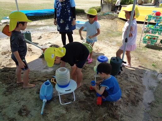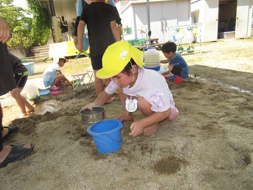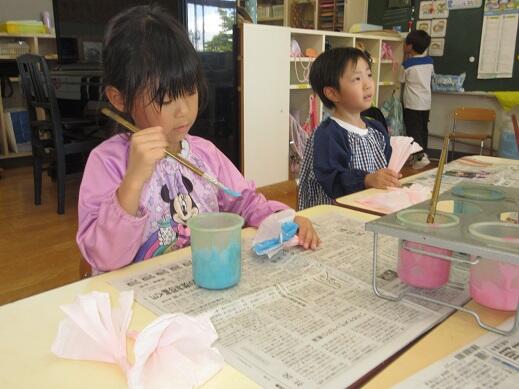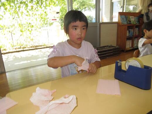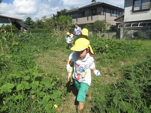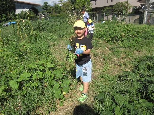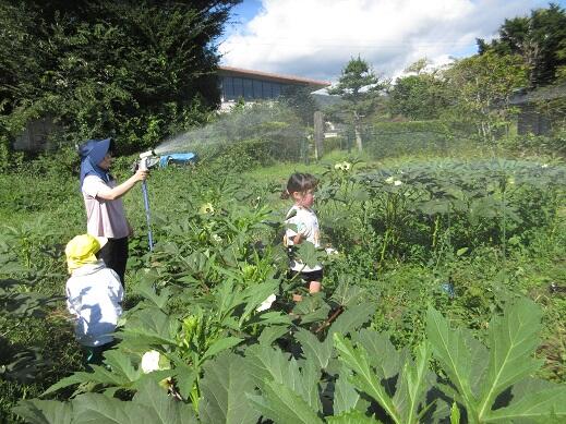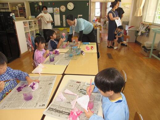 9月2日(月) フリー参観日を実施しました。普段は来れない祖父母の皆さんも来園され、子ども達の様子を参観してもらいました。まずは、朝の野菜の収穫です。ナスやキュウリの他、トマトや大根もたくさん収穫しました。次に、部屋に戻り、朝顔の制作をしました。クレープ紙に絵の具で色をつけて完成させました。最後は、プールでの水遊びや砂場遊びです。楽しく過ごした一日となりました。