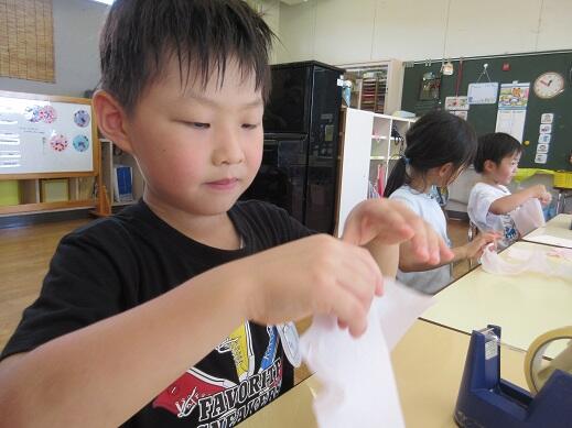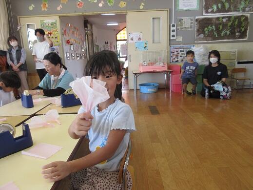 2024年9月2日 14時08分9月2日(月) フリー参観日を実施しました。普段は来れない祖父母の皆さんも来園され、子ども達の様子を参観してもらいました。まずは、朝の野菜の収穫です。ナスやキュウリの他、トマトや大根もたくさん収穫しました。次に、部屋に戻り、朝顔の制作をしました。クレープ紙に絵の具で色をつけて完成させました。最後は、プールでの水遊びや砂場遊びです。楽しく過ごした一日となりました。