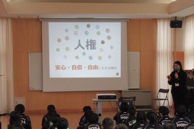 講師の先生からは、「男のくせに」「女なのに」といった、性別で縛りつけるようなものの見方そのものが偏ったものであり、その人の個性、その人らしさを尊重してほしいというお話がありました。また、「人権は、好き勝手に何をやってもよいものではない」というお話もされました。好き勝手にふるまうことは、相手の「人権」を奪うことにもなるからです。相手を尊重することは、自分を大切にすることにもつながります。子どもたちに「人権」の意識が育つことを心から願いました。
