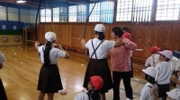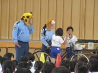 福島市交通教育専門員の高橋さん、渡辺さんに、交通のきまりや自転車の安全な乗り方などについて教えていただきました。きりんさんとさるさんに扮したお二人の話を聞いて、あらためて安全な歩行の仕方や自転車の乗り方を確認しました。