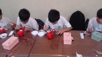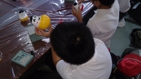 天候が回復し、みな元気で、体験・見学を行っています。昼食は、班ごとに市内の店舗を利用します。写真は「あかべこ・おきあがりこぼし」の製作体験の様子です。