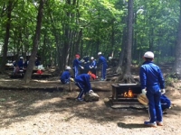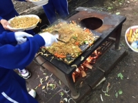 午前の活動、野外炊飯を予定通り行っています。焼きそばが完成し、少し早めの昼食です。