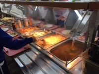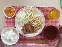 こどもたちが楽しみにしている自然の家の夕食。はんぺん、餃子、焼うどん、サラダ、ポテト、フルーツポンチ等美味しいものがたくさんあります。