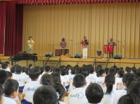 ◇ 6月14日、鑑賞教室を行いました。『アフリカンオールスターによる、アフリカ体験ふれあいコンサート』と題し、情熱的なアフリカンミュージックを鑑賞しました。歌あり、笑いあり、ダンスあり、アフリカ豆知識あり…全校生のりのりの楽しい会でした。