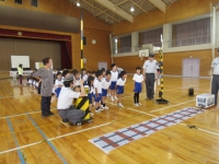 野田小学校の周りにはたくさんのふみきりがあります。JRの皆さんに正しいふみきりの渡り方や注意することなどを教えていただきました。模擬ふみきりを使ってふみきりをわたる練習をしました。さっそく今日から実践します。