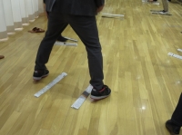 (折りたたんだ新聞紙をラインに見立て運動します。)