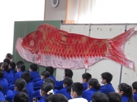 (授業の様子) (震災復興へのメッセージが書き込まれた鯉のぼり)