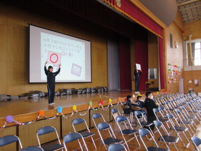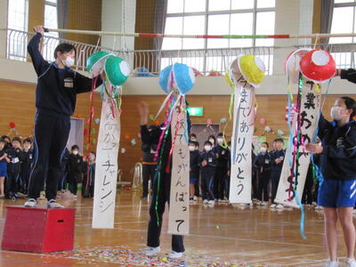 本日、6年生を送る会が行われました。これまでの6年生への感謝の気持ちを込めて、各学級ごとに書いたメッセージや5年生が作った飾りつけが体育館壁面に飾られ、5年生が中心となって会を運営しました。在校生からの感謝の合唱、6年生〇×クイズ、6年生と一緒にダンス等、みんなで楽しい思い出を作ることができました。引き続き、鼓笛移杖式が行われ、6年生から5年生へ伝統のバトンが渡されました。6年生から手ほどきを受けてきた5年生の演奏や演技はとても素晴らしく、息もぴったり合っていました。6年生にとっても1~5年生にとっても、共に過ごした学校生活を振り返る思い出深い時間となりました。