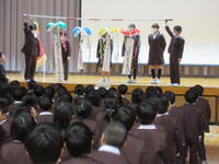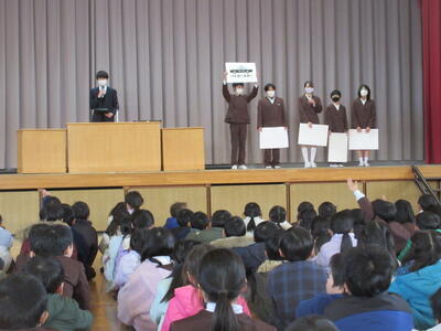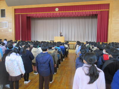 最後に、生徒指導の先生から、冬休みの約束として、「パトカー、救急車、消防車にはお世話にならないこと」「お金を大切に使うこと」「規則正しく生活すること」について話がありました。生徒指導の先生からの話をしっかり守って、楽しく有意義な冬休みを過ごしてほしいと思います。