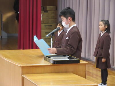 次に、1・3・5年生の代表児童3名による作文発表があり、全校生で校歌を元気よく歌いました。
