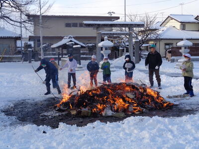 3年生は、地区にある大原神社のどんと焼きに参加しました。地域の未来を担う子どもたちにとって、地域の風習や伝統行事を知ることはとても大切なことです。子どもたちは、みんなで協力して、地域の方々が神社に納めたお正月飾りを焼きました。
