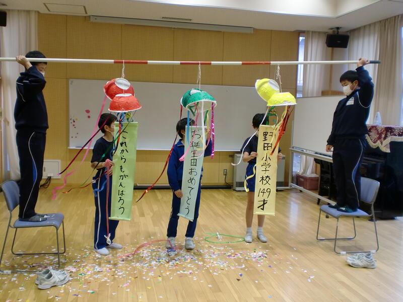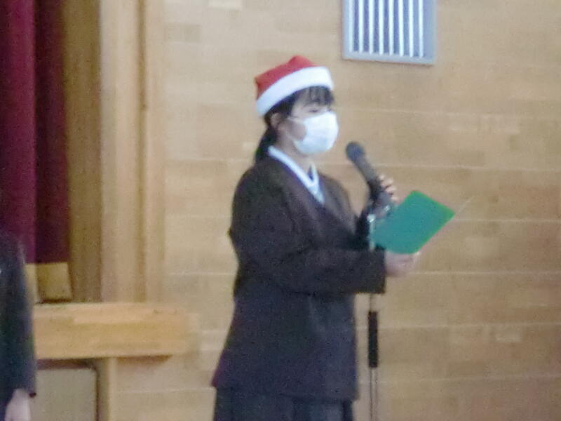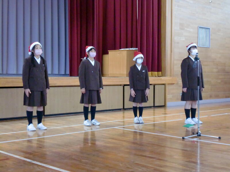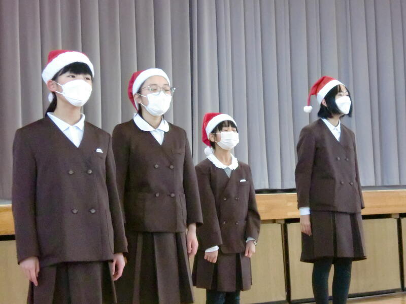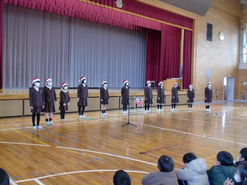 2022年12月23日 11時09分 12月21日(水)と22日(木)のお昼休みに、合唱部の子どもたちが「クリスマスコンサート」を開きました。披露した曲目は「きよしこの夜」「ジングルベル」「もろびとこぞりて」のメドレーとNHKの「みんなのうた」でおなじみの「虹」、そして朝ドラ「エール」の主題歌「星影のエール」です。