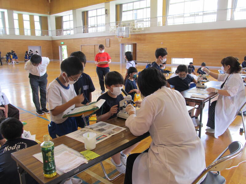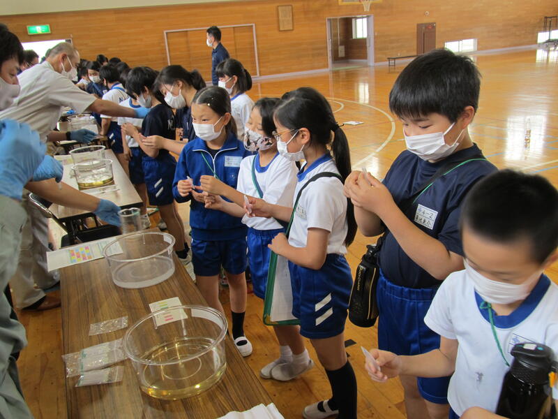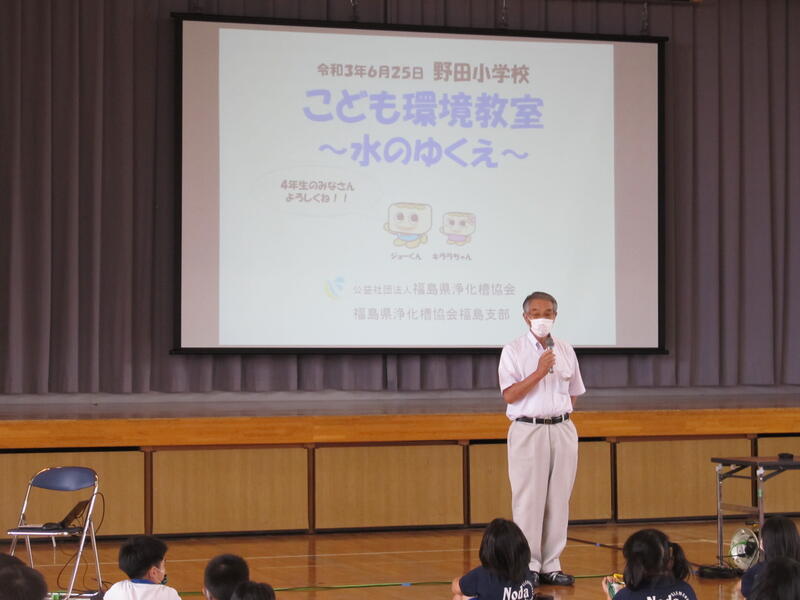2021年6月25日 20時03分25日(金)4年生は「子ども環境教室」の出前講座を体育館で行いました。およそ20名あまりの福島県浄化槽協会の方々が野田小学校においでになり、子どもたちに浄化槽の仕組みや中の様子、水のろ過実験、微生物の観察、水の汚れ具合を見る実験等、様々な活動をとおして、水をきれいにするためにたくさんの仕組みや大量の水が必要であるということがわかりました。現在4年生は、社会科で「水のゆくえ」の学習をしていますので、子どもたちも非常に興味をもって参加することができました。