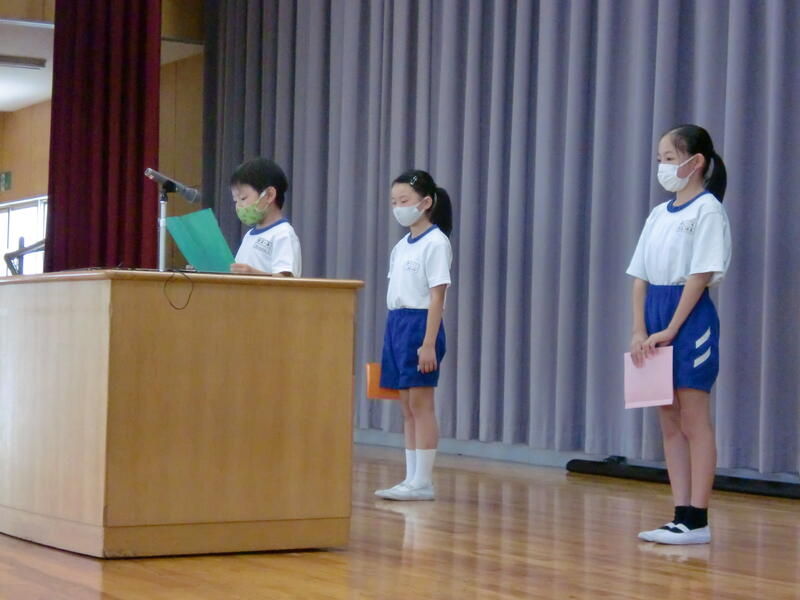 6年生と、代表発表児童、表彰児童、そして合唱部の児童が体育館で、それ以外の児童は教室(オンライン)で終業式に臨みました。まずは、表彰です。1学期に各大会で活躍した児童の表彰を行いました。次に終業式です。校長先生の話や、2・4・6年の代表児童からの発表がありました。