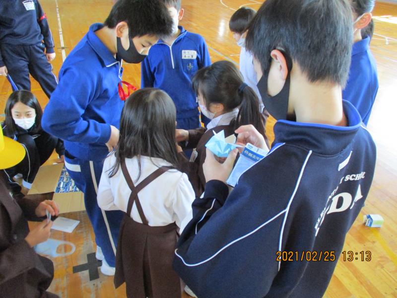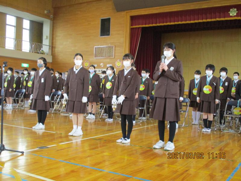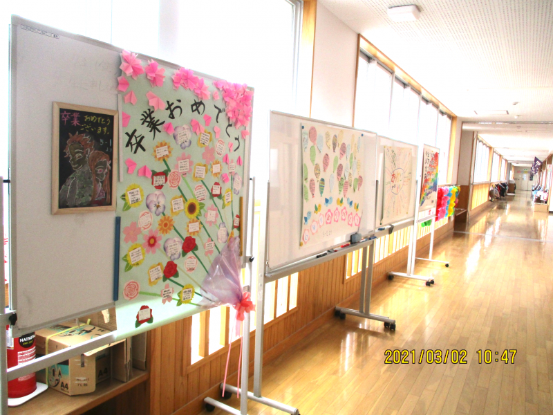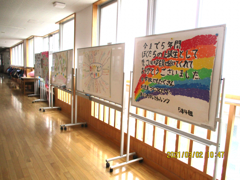 2021年3月2日 19時34分 3月2日(火)3校時に6年生を送る会が行われました。コロナ禍で全校生が集まれないため、5・6年生は体育館、1~4年生は各教室で体育館をオンラインでつなげて見るという形で行いました。廊下にも6年生へメッセージを飾り、これまでお世話になった6年生へ感謝の思いを送りました。