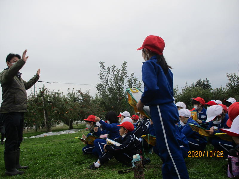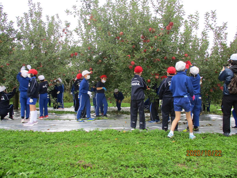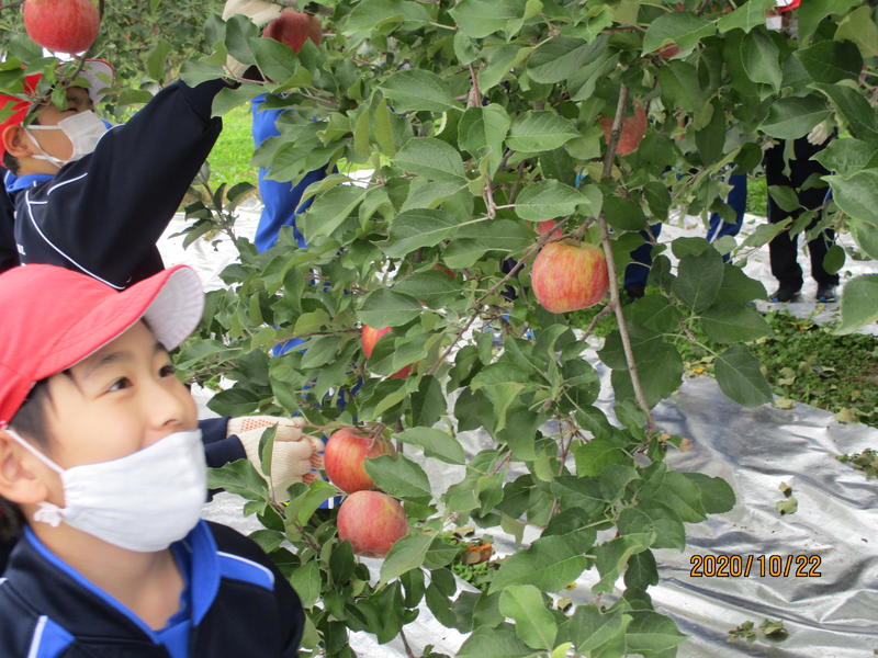 2020年10月26日 13時18分10月22日(木)4年生の総合学習で学校近くのりんご園に農作業体験学習に行きました。子どもたちは、りんご園の方の説明を聞き、赤く実ったリンゴの木から葉っぱを剪定する作業に一生懸命取り組んでいました。