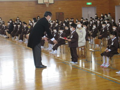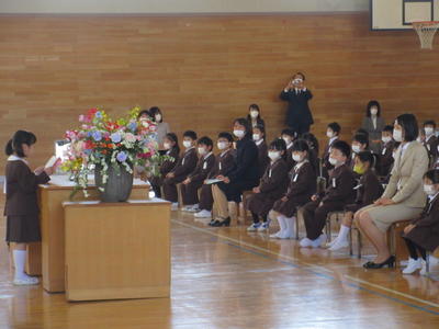卒業生は、約3週間ぶりの登校となり、しかも卒業式の練習も十分できない中でしたが、一人一人が6年間の学びを生かして、堂々と入場し、卒業証書を授与され、校歌を合唱し、胸を張って退場しました。保護者の皆様も、お子さんの成長を強く実感されたことでしょう。私たち職員も卒業生の姿に胸が熱くなりました。これからも、「夢に向かってチャレンジ」を胸に、中学校でも自分らしさを発揮していけるよう願っております。職員一同、心より卒業生の前途を期待し、お祝い申し上げます。